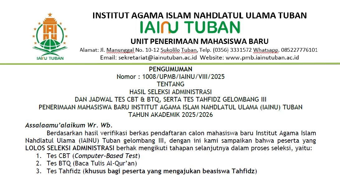 Pengumuman Jadwal Pelaksanaan Ujian Tes PMB Gelombang II 2025/2026 IAINU Tuban