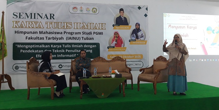Karena itu, Fakultas Tarbiyah Institut Agama Islam Nahdlatul Ulama (IAINU) Tuban, melalui Himpunan Mahasiswa Program Studi Pendidikan Guru Madrasah Ibtidaiyah (HMP PGMI) menggelar seminar karya tulis ilmiah. Seminar dengan tema : Mengoptimalkan Karya Tulis Ilmiah dengan Pendekatan dan Teknik Penulisan yang Efektif dan Informatif itu menghadirkan pemateri Supriyanto, M.Pd Wakil Rektor Bidang Akademik IAINU Tuban dan Nurul Ngainin, M.Pd Sekretaris Lembaga Penelitian dan Pengabdian Masyarakat (LPPM) IAINU Tuban.