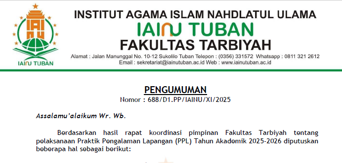 Assalamualaikum Wr.Wb. Menyampaikan Edaran PPL Fakultas Tarbiyah Download disini Wassalamu’alaikum Wr.Wb. Bagikan Berita Navigasi pos SK Pembimbing Proposal dan Skripsi Fakultas Dakwah dan Febi Pengumuman Jadwal PKL Fakultas FEBI