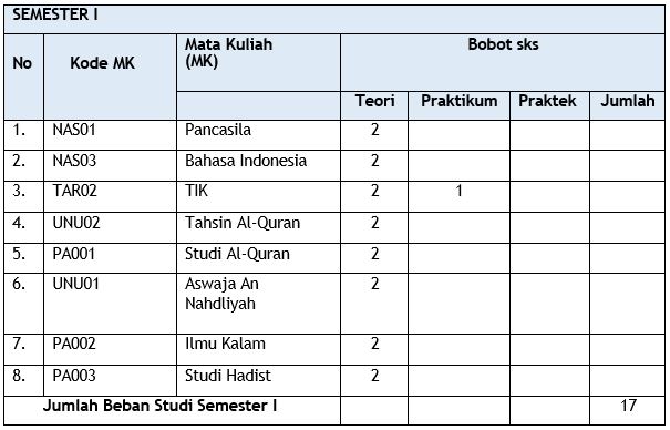 | Profil Lulusan | Pendidik Agama Islam Yang Moderat Pendidik dalam bidang Agama Islam pada lembaga pendidikan formal (madrasah tsanawiyah, madrasah aliyah dan yang sederajat), maupun non formal (madrasah diniyah dan yang sederajat) yang berkepribadian baik, berpengetahuan luas dan mutakhir di bidangnya serta bertanggung jawab terhadap pelaksanaan tugas berlandaskan etika keilmuan Islam yang berkarakter ahlussunnah wal jamaah an nahdliyah Edupreneur Memiliki kepekaan melihat potensi dalam mengembangkan pendidikan formal (madrasah tsanawiyah, madrasah aliyah dan yang sederajat), maupun non formal (madrasah diniyah dan yang sederajat) yang melandaskan setiap amaliyahnya sesuai dengan tuntunan agamanya dan menciptakan identitas diri dan kredibilitas pribadi yang mampu menebarkan manfaat bagi manusia dan sesama terhadap Allah SWT Peneliti Pemula Sarjana pendidikan yang memiliki kemampuan kerja, penguasaan pengetahuan, kemampuan manajerial dan tanggung jawab sebagai asisten peneliti dalam bidang Pendidikan Agama Islam yang berkepribadian baik, berpengetahuan luas dan mutakhir dibidangnya serta mampu melaksanakan tugas dan bertanggung jawab berlandaskan ajaran dan etika keislaman, keilmuan dan keahlian. |